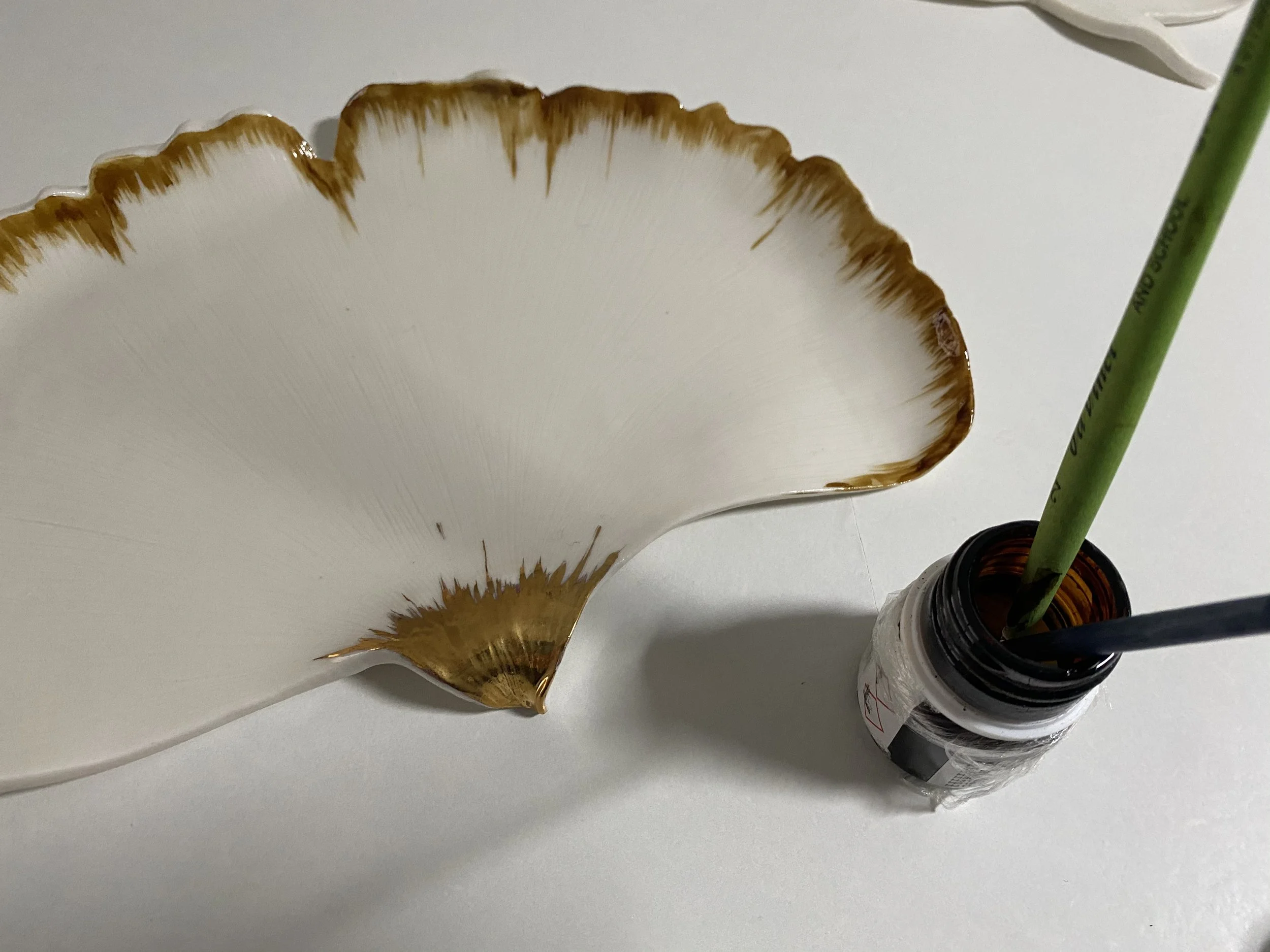 In some cases we use gold lustre to enhance detail . Lustre is applied over a glazed surface and fired at 700C , so it’s takes three firings to produce the item . It is usually hand painted and requires fine brushstrokes plus sometimes a double application, which makes whole process very time consuming, and that’s reflected in the price of production.